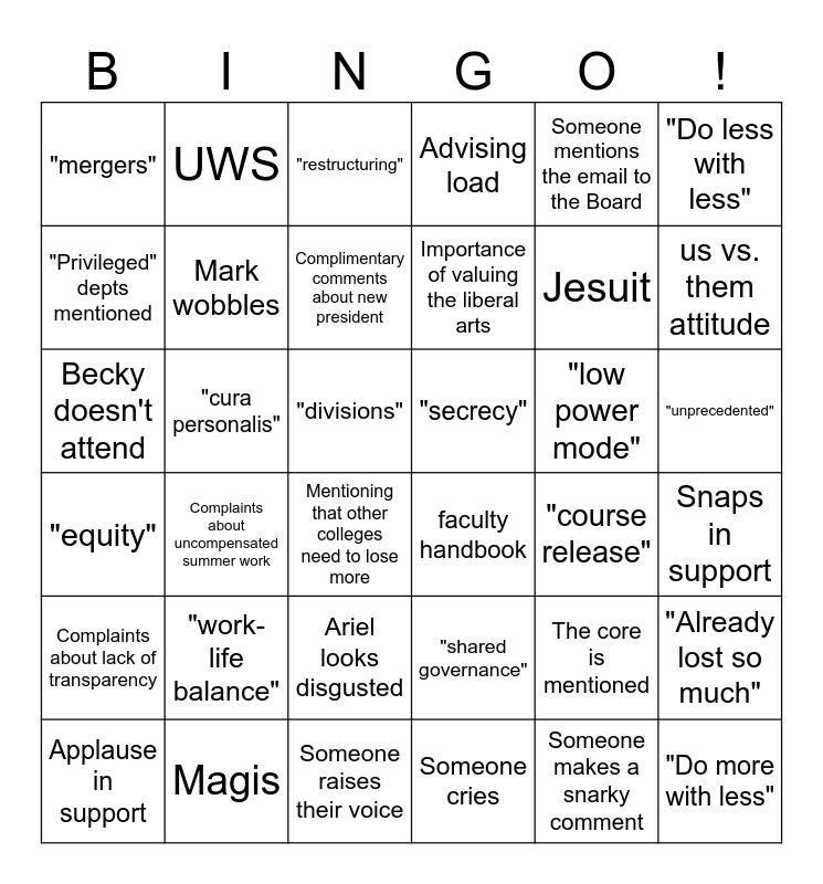 This bingo card has 36 words: "shared governance", Ariel looks disgusted, Someone cries, "Privileged" depts mentioned, "equity", "secrecy", Mark wobbles, Someone raises their voice, Someone mentions the email to the Board, The core is mentioned, us vs. them attitude, Advising load, "Already lost so much", "cura personalis", Importance of valuing the liberal arts, "mergers", Complaints about lack of transparency, "low power mode", Becky doesn't attend, "restructuring", "divisions", Complaints about uncompensated summer work, faculty handbook, Mentioning that other colleges need to lose more, "course release", UWS, Jesuit, Magis, Complimentary comments about new president, "Do less with less", "Do more with less", Applause in support, Snaps in support, "unprecedented", "work-life balance" and Someone makes a snarky comment.