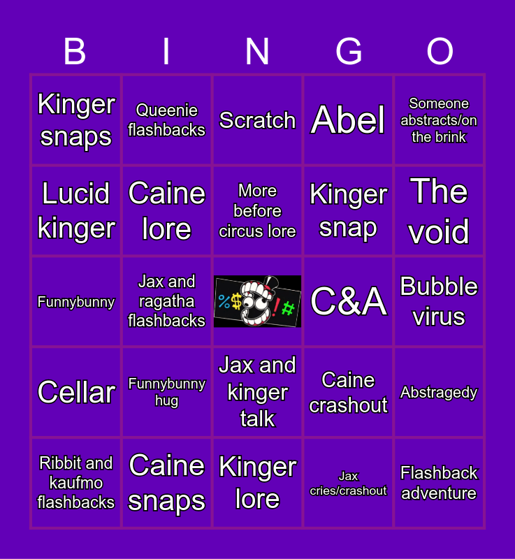 This bingo card has a free space and 24 words: Funnybunny hug, Caine snaps, More before circus lore, Ribbit and kaufmo flashbacks, Someone abstracts/on the brink, Kinger snaps, Lucid kinger, Queenie flashbacks, C&A, Jax and kinger talk, Kinger snap, Funnybunny, Caine crashout, Abstragedy, Caine lore, Jax cries/crashout, Bubble virus, Scratch, The void, Jax and ragatha flashbacks, Flashback adventure, Cellar, Abel and Kinger lore.