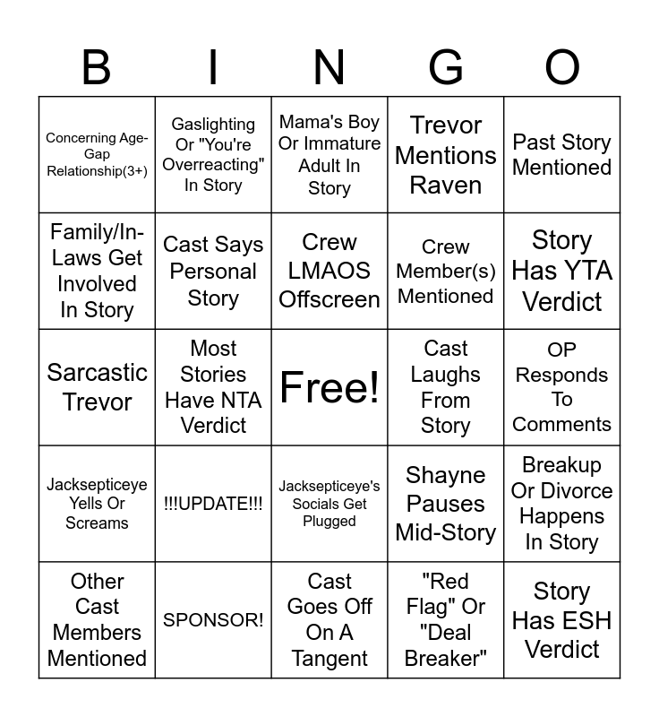 This bingo card has a free space and 24 words: !!!UPDATE!!!, SPONSOR!, Crew LMAOS Offscreen, Other Cast Members Mentioned, Past Story Mentioned, Concerning Age-Gap Relationship(3+), Family/In-Laws Get Involved In Story, Gaslighting Or "You're Overreacting" In Story, Cast Laughs From Story, Jacksepticeye's Socials Get Plugged, Crew Member(s) Mentioned, Sarcastic Trevor, Shayne Pauses Mid-Story, Breakup Or Divorce Happens In Story, Cast Says Personal Story, "Red Flag" Or "Deal Breaker", OP Responds To Comments, Mama's Boy Or Immature Adult In Story, Story Has YTA Verdict, Most Stories Have NTA Verdict, Story Has ESH Verdict, Jacksepticeye Yells Or Screams, Trevor Mentions Raven and Cast Goes Off On A Tangent.