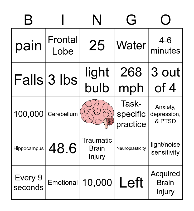 This bingo card has a free space and 24 words: 48.6, Emotional, light bulb, Every 9 seconds, 4-6 minutes, pain, Falls, Frontal Lobe, Task-specific practice, Traumatic Brain Injury, 268 mph, 100,000, Neuroplasticity, light/noise sensitivity, 3 lbs, Left, Anxiety, depression, & PTSD, 25, 3 out of 4, Cerebellum, Acquired Brain Injury, Hippocampus, Water and 10,000.