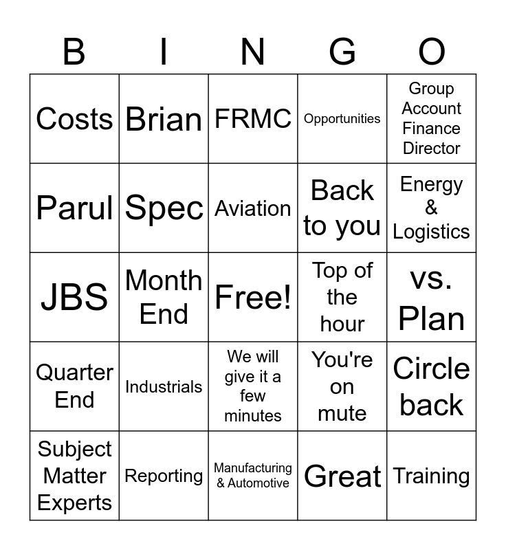 This bingo card has a free space and 24 words: Industrials, Reporting, Aviation, Subject Matter Experts, Group Account Finance Director, Costs, Parul, Brian, Top of the hour, We will give it a few minutes, Back to you, JBS, You're on mute, Circle back, Spec, Great, vs. Plan, FRMC, Energy & Logistics, Month End, Training, Quarter End, Opportunities and Manufacturing & Automotive.