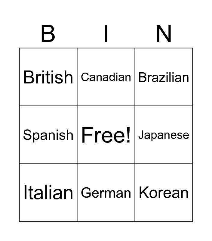 This bingo card has a free space and 17 words: American, Chinese, Brazilian, British, Argentinian, Spanish, Mexican, Italian, German, Japanese, Colombian, Portuguese, Korean, Canadian, Ecuatorian, Russian and Australian.