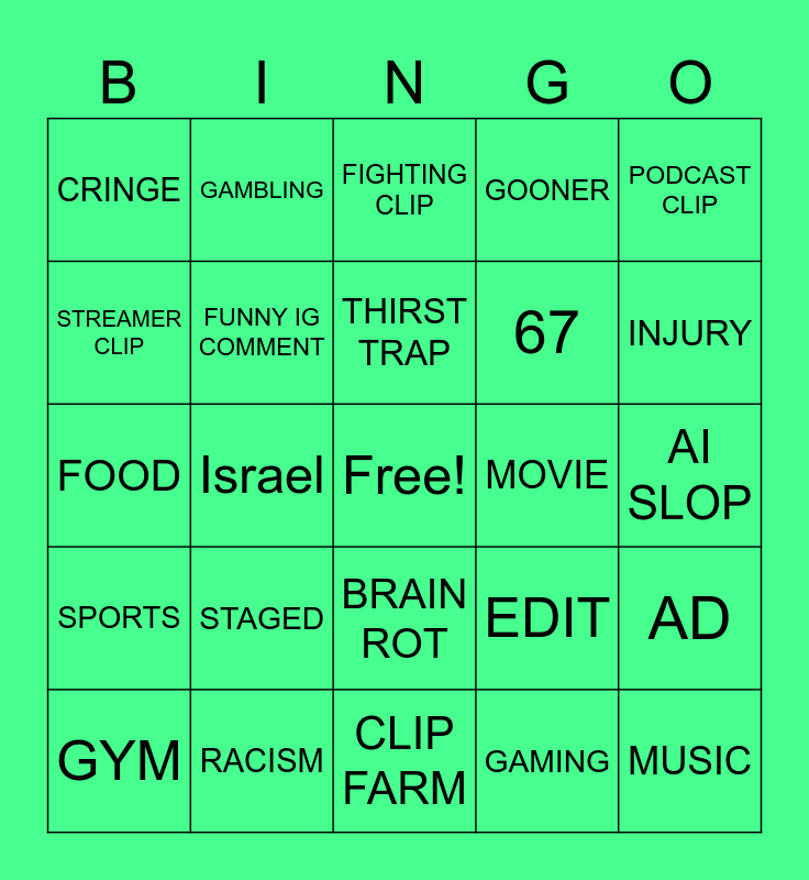 This bingo card has a free space and 24 words: GYM, STAGED, THIRST TRAP, GAMING, PODCAST CLIP, CRINGE, GAMBLING, FIGHTING CLIP, MOVIE, AI SLOP, FOOD, FUNNY IG COMMENT, EDIT, AD, STREAMER CLIP, RACISM, CLIP FARM, GOONER, INJURY, SPORTS, Israel, BRAIN ROT, 67 and MUSIC.