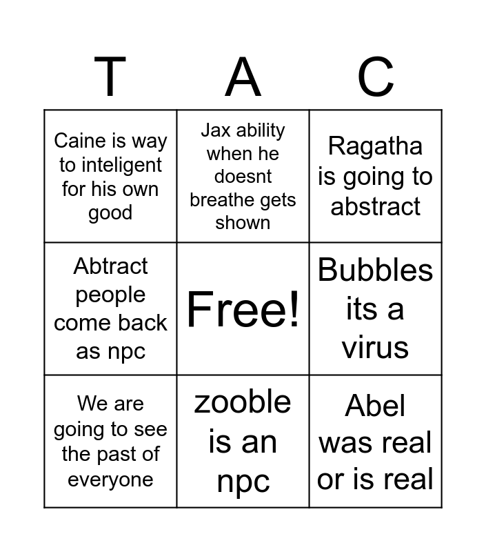 This bingo card has a free space and 8 words: Bubbles its a virus, Ragatha is going to abstract, Jax ability when he doesnt breathe gets shown, We are going to see the past of everyone, Caine is way to inteligent for his own good, Abel was real or is real, Abtract people come back as npc and zooble is an npc.
