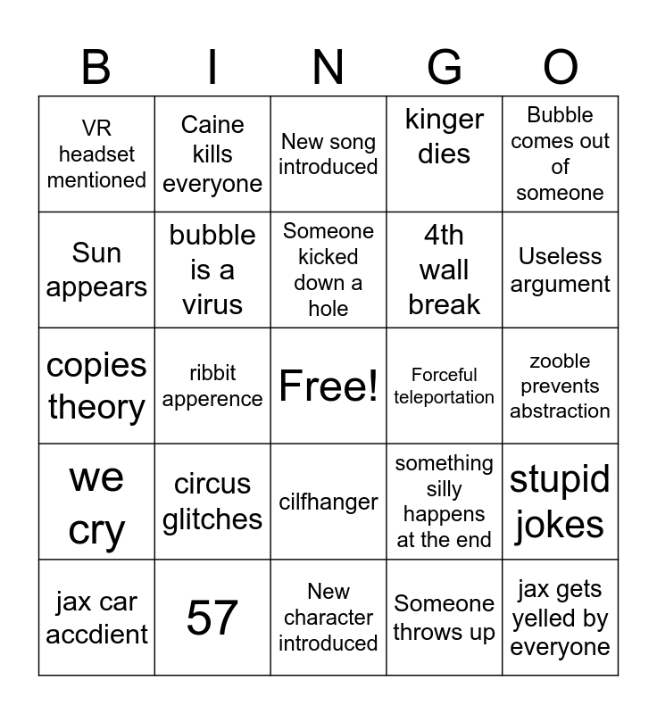 This bingo card has a free space and 50 words: Cannon Death, jax gets yelled by everyone, Bubble gets popped, New character introduced, circus glitches, Pomni breakdown, Caine kills everyone, Moon appears, Sun appears, ragatha backstry, bubble is a virus, kinger dies, stupid jokes, something silly happens at the end, Mask gets broken, something is reveled then found out it a lie, Someone kicked down a hole, Forceful teleportation, jax acting emo, Bubble comes out of someone, ribbit apperence, Someone throws up, VR headset mentioned, 4th wall break, zooble dies, Something sexual, Useless argument, Convenient plot device, New song introduced, cilfhanger, they all die, jax dies, flashbacks to real world, kinger acts like a dad, 57, cellar, google yuri, kinger is sane, jax becomes kind, zooble prevents abstraction, C and A lore, the truth comes out, someone excapes, pomni talks to jax, jax car accdient, copies theory, kaufmo, scratch lore, we cry and queenie lore.