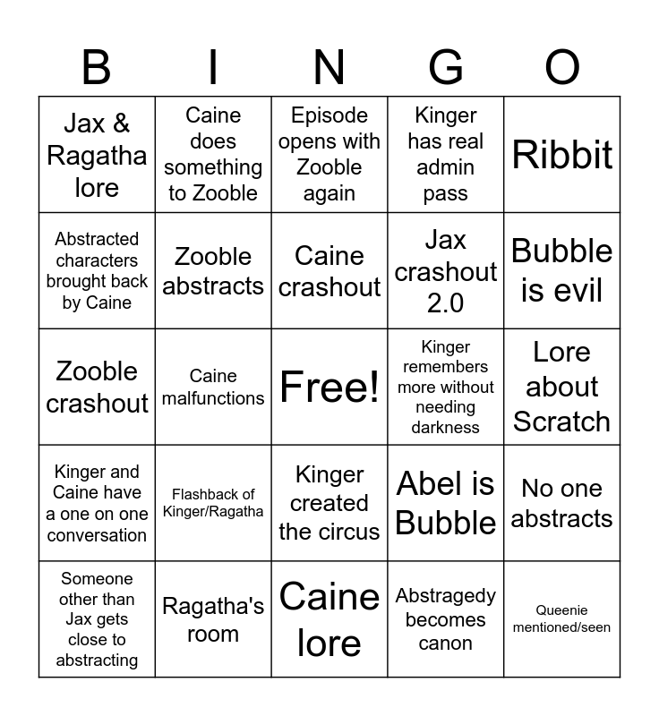 This bingo card has a free space and 24 words: Flashback of Kinger/Ragatha, Ragatha's room, Caine crashout, Someone other than Jax gets close to abstracting, Ribbit, Jax & Ragatha lore, Abstracted characters brought back by Caine, Caine does something to Zooble, Kinger remembers more without needing darkness, Kinger created the circus, Jax crashout 2.0, Zooble crashout, Abel is Bubble, No one abstracts, Zooble abstracts, Abstragedy becomes canon, Lore about Scratch, Episode opens with Zooble again, Bubble is evil, Caine malfunctions, Queenie mentioned/seen, Kinger and Caine have a one on one conversation, Kinger has real admin pass and Caine lore.