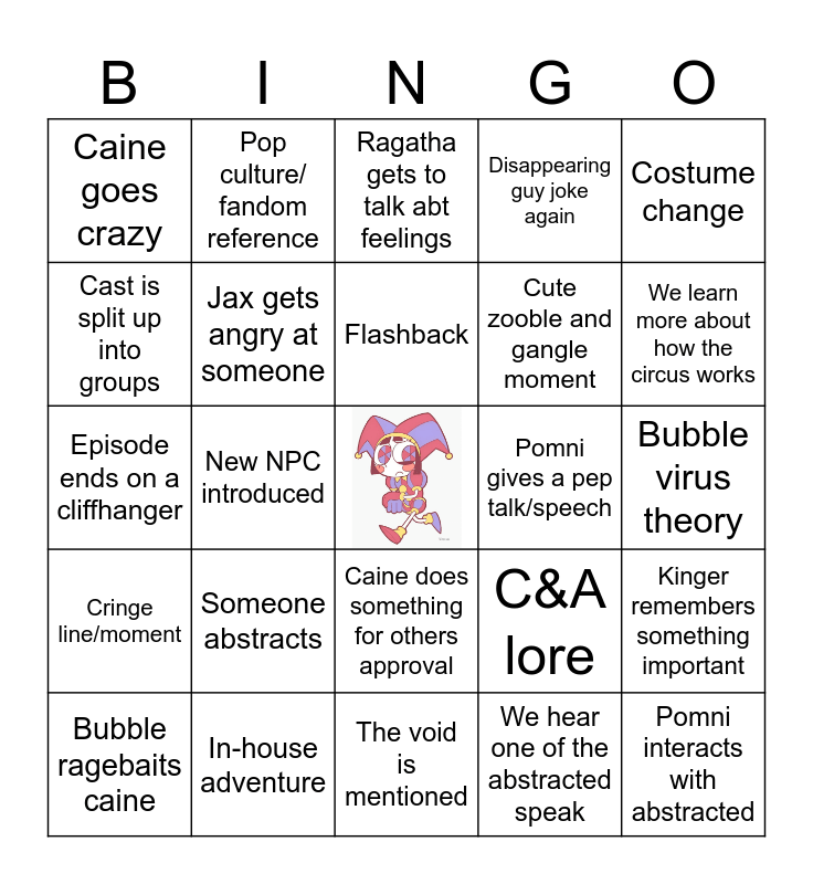 This bingo card has a free space and 24 words: Someone abstracts, In-house adventure, Flashback, Bubble ragebaits caine, Costume change, Caine goes crazy, Cast is split up into groups, Pop culture/ fandom reference, Pomni gives a pep talk/speech, Caine does something for others approval, Cute zooble and gangle moment, Episode ends on a cliffhanger, C&A lore, Kinger remembers something important, Jax gets angry at someone, We hear one of the abstracted speak, Bubble virus theory, Ragatha gets to talk abt feelings, We learn more about how the circus works, New NPC introduced, Pomni interacts with abstracted, Cringe line/moment, Disappearing guy joke again and The void is mentioned.