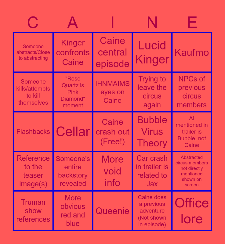 This bingo card has a free space and 44 words: Ribbit, Office lore, Zooble and Caine beef, Truman show references, Caine swears, Caine does a previous adventure (Not shown in episode), Caine central episode, The buttons are mentioned, Kaufmo, More obvious red and blue, Lucid Kinger, Bubble Virus Theory, More void info, Someone's entire backstory revealed, Someone attacks Caine, Queenie, In media res (First 3.5 mins), Flashbacks, 57, NPCs of previous circus members, Kinger confronts Caine, Jax crash out, Abel, Someone abstracts/Close to abstracting, NPCs from previous adventures (e.g. Gummigoo), AI mentioned in trailer is Bubble, not Caine, Kinger entering circus B4 Queenie, Cast's first day, Car crash in trailer is related to Jax, Reference to the teaser image(s), Scratch, Abstracted circus members not directly mentioned shown on screen, Get names for other circus members, Abstraction let loose, Cellar, Someone unabstracts, Lover mentioned in trailer is Caine, Bees, IHNMAIMS eyes on Caine, Someone kills/attempts to kill themselves, Trying to leave the circus again, Shrimp Town, "Rose Quartz is Pink Diamond" moment and Left with more questions than answers again.