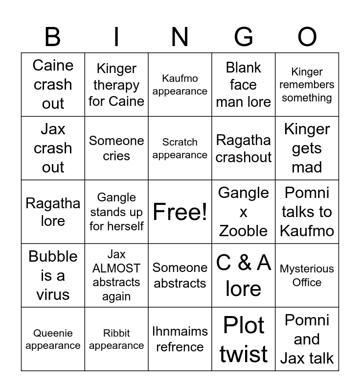 This bingo card has a free space and 24 words: Jax ALMOST abstracts again, Ribbit appearance, Scratch appearance, Queenie appearance, Kinger remembers something, Caine crash out, Jax crash out, Kinger therapy for Caine, Gangle x Zooble, Someone abstracts, Ragatha crashout, Ragatha lore, C & A lore, Mysterious Office, Someone cries, Plot twist, Pomni talks to Kaufmo, Kaufmo appearance, Kinger gets mad, Gangle stands up for herself, Pomni and Jax talk, Bubble is a virus, Blank face man lore and Ihnmaims refrence.