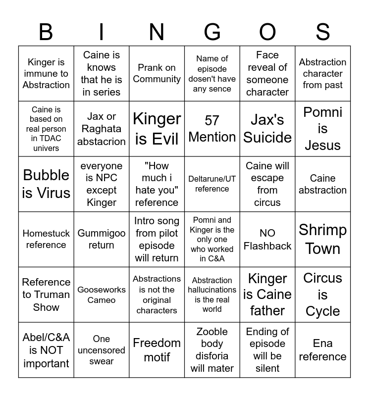 This bingo card has 36 words: Abstraction hallucinations is the real world, Abstractions is not the original characters, Zooble body disforia will mater, Caine is based on real person in TDAC univers, Homestuck reference, Deltarune/UT reference, Jax or Raghata abstacrion, Freedom motif, Face reveal of someone character, Kinger is Caine father, Pomni is Jesus, Name of episode dosen't have any sence, Circus is Cycle, everyone is NPC except Kinger, 57 Mention, Kinger is immune to Abstraction, Reference to Truman Show, Caine will escape from circus, Bubble is Virus, Prank on Community, "How much i hate you" reference, Gummigoo return, Pomni and Kinger is the only one who worked in C&A, Intro song from pilot episode will return, NO Flashback, Caine is knows that he is in series, Jax's Suicide, One uncensored swear, Kinger is Evil, Abstraction character from past, Ena reference, Abel/C&A is NOT important, Shrimp Town, Caine abstraction, Gooseworks Cameo and Ending of episode will be silent.