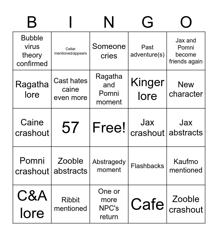 This bingo card has a free space and 24 words: Zooble abstracts, Ribbit mentioned, Ragatha and Pomni moment, C&A lore, Jax and Pomni become friends again, Bubble virus theory confirmed, Ragatha lore, Cellar mentioned/appears, Jax crashout, Abstragedy moment, Kinger lore, Caine crashout, Flashbacks, Kaufmo mentioned, Cast hates caine even more, Cafe, Jax abstracts, Someone cries, New character, 57, Zooble crashout, Pomni crashout, Past adventure(s) and One or more NPC's return.