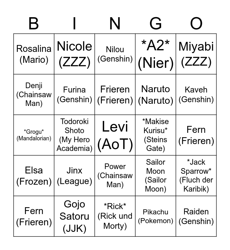This bingo card has a free space and 24 words: Jinx (League), Gojo Satoru (JJK), Frieren (Frieren), Fern (Frieren), Miyabi (ZZZ), Rosalina (Mario), Denji (Chainsaw Man), Nicole (ZZZ), *Makise Kurisu* (Steins Gate), Power (Chainsaw Man), Naruto (Naruto), *Grogu* (Mandalorian), Sailor Moon (Sailor Moon), *Jack Sparrow* (Fluch der Karibik), Furina (Genshin), Pikachu (Pokemon), Fern (Frieren), Nilou (Genshin), Kaveh (Genshin), Todoroki Shoto (My Hero Academia), Raiden (Genshin), Elsa (Frozen), *A2* (Nier) and *Rick* (Rick und Morty).