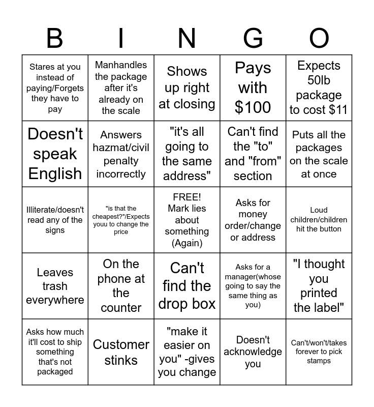 This bingo card has a free space and 49 words: Already there before you've opened, Can't/won't/takes forever to pick stamps, 10+ packages, "make it easier on you" -gives you change, On the phone at the counter, Asks for the arrival date after you've already said it, Manhandles the package after it's already on the scale, "I want to mail this" (Random unpackaged items), Doesn't speak English, Doesn't know how a card reader works, Answers hazmat/civil penalty incorrectly, Pays with $100, "I thought you printed the label", Asks for a manager(whose going to say the same thing as you), "Do you have any other box sizes", Needs their label printed, "it's all going to the same address", Asks for money order/change or address, Tells you everything(their life story) that got them to this point, Expects 50lb package to cost $11, "is that the cheapest?"/Expects youu to change the price, Doesn't acknowledge you, Stares at you instead of paying/Forgets they have to pay, Can't find the "to" and "from" section, Awkwardly addresses and packs package at the counter, Puts all the packages on the scale at once, Asks how much it'll cost to ship something that's not packaged, "I could just drive it there", Can't find the drop box, Leaves trash everywhere, Slaps money on the scale before you're done, Hasn't filled out certified/return receipt, "Back in my day stamps were (26 cants)", Walks off without receipt, Customer stinks, 4+ Certified/Return receipt, Mail is addressed wrong/backwards, "I have to write the address?", Loud children/children hit the button, Says no before you finish "is there anything liquid-", Makes you build the box for them, Expects free tape, "And I have a number" after they already paid, Buys a single stamp, Illiterate/doesn't read any of the signs, Shows up right at closing, Can't use their words/expects you to read their mind, "It says my package is still here" and Mentions the line or lack thereof.