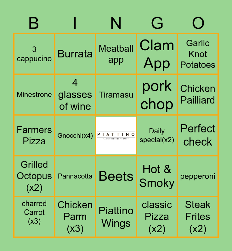 This bingo card has a free space and 27 words: Hot & Smoky, Crab Ravioli (x2), pork chop, Piattino Wings, Minestrone, Meatball app, Burrata, Grilled Octopus (x2), Daily special(x2), pepperoni, Farmers Pizza, Clam App, charred Carrot (x3), Chicken Parm (x3), Chicken Pailliard, Yuengling (x2), 4 glasses of wine, Tiramasu, Pannacotta, 3 cappucino, Perfect check, classic Pizza (x2), Gnocchi(x4), Steak Frites (x2), Beets, Garlic Knot Potatoes and Salmon entree.