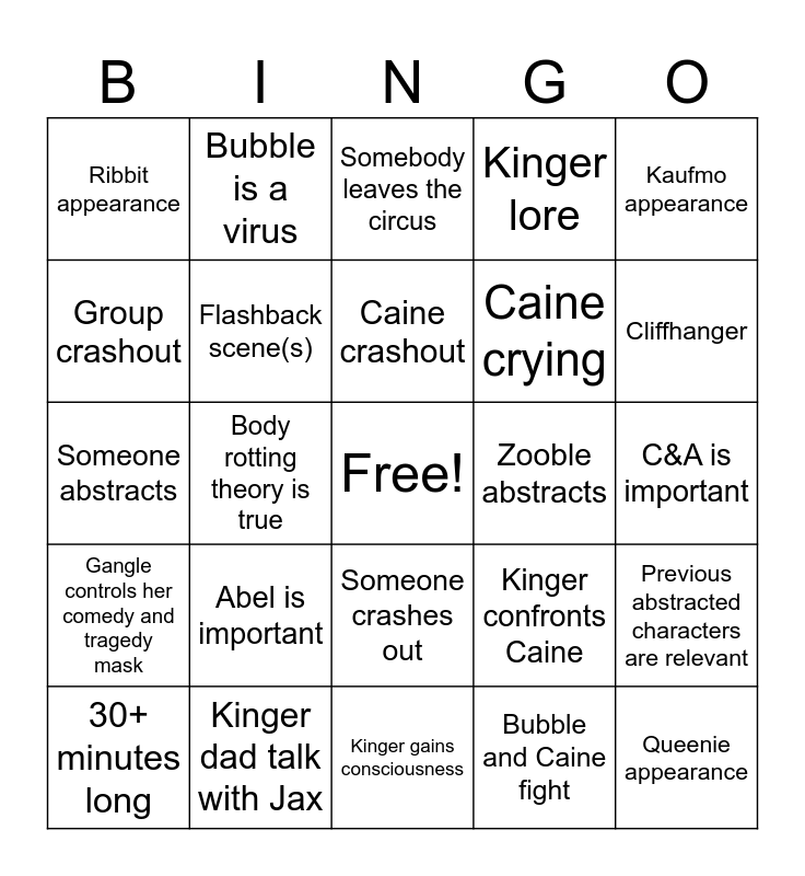 This bingo card has a free space and 24 words: Abel is important, Kinger dad talk with Jax, Caine crashout, 30+ minutes long, Kaufmo appearance, Ribbit appearance, Group crashout, Bubble is a virus, Zooble abstracts, Someone crashes out, Caine crying, Someone abstracts, Kinger confronts Caine, Previous abstracted characters are relevant, Flashback scene(s), Bubble and Caine fight, C&A is important, Somebody leaves the circus, Cliffhanger, Body rotting theory is true, Queenie appearance, Gangle controls her comedy and tragedy mask, Kinger lore and Kinger gains consciousness.