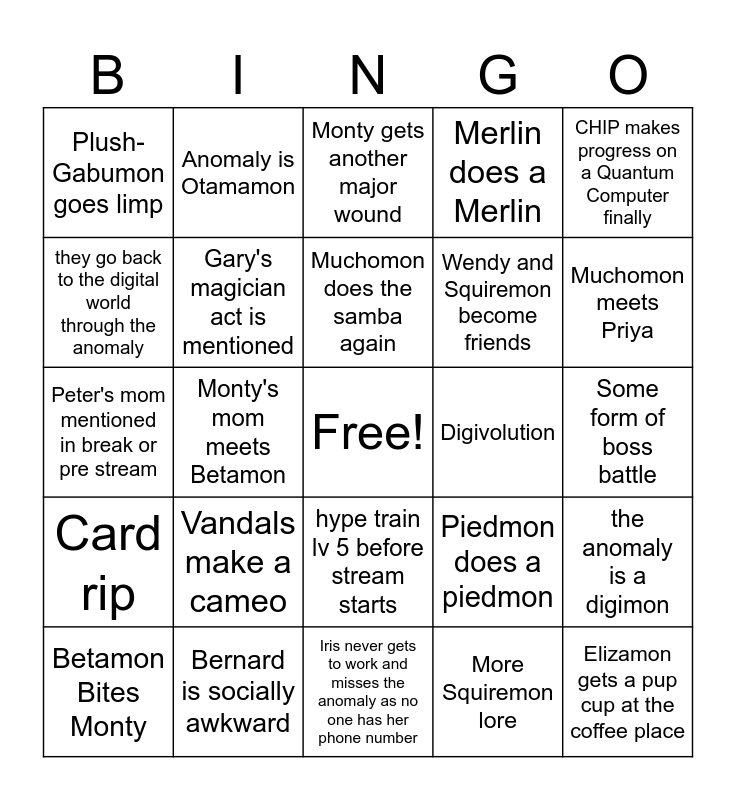 This bingo card has a free space and 24 words: Vandals make a cameo, Bernard is socially awkward, Muchomon does the samba again, Betamon Bites Monty, CHIP makes progress on a Quantum Computer finally, Plush-Gabumon goes limp, they go back to the digital world through the anomaly, Anomaly is Otamamon, Digivolution, hype train lv 5 before stream starts, Wendy and Squiremon become friends, Peter's mom mentioned in break or pre stream, Piedmon does a piedmon, the anomaly is a digimon, Gary's magician act is mentioned, More Squiremon lore, Some form of boss battle, Monty gets another major wound, Muchomon meets Priya, Monty's mom meets Betamon, Elizamon gets a pup cup at the coffee place, Card rip, Merlin does a Merlin and Iris never gets to work and misses the anomaly as no one has her phone number.