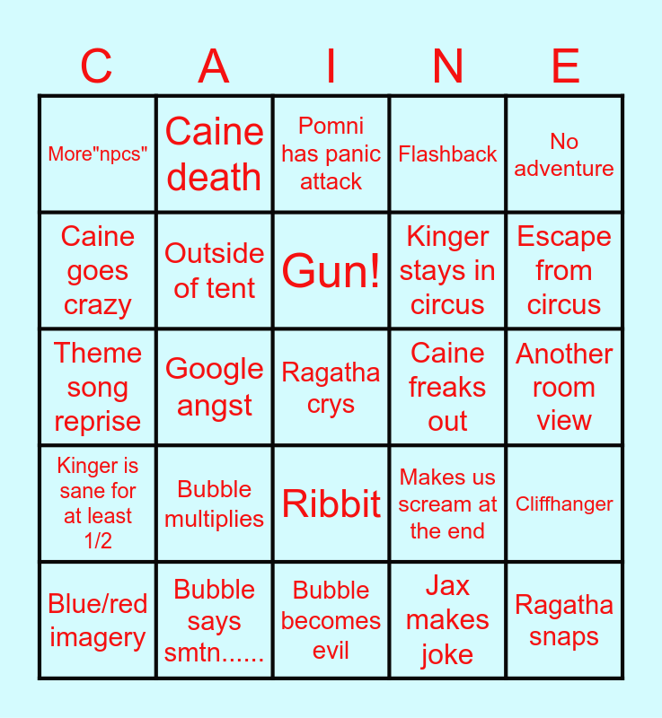 This bingo card has 35 words: Injury/death, Void, Abstraction, Outside of tent, Ribbit, Flashback, Caine goes crazy, Queenie, Gun!, Funnybunny angst, Theme song reprise, No adventure, Free!, Glitch reference, More"npcs", Caine freaks out, Jax makes joke, Google angst, Kinger is sane for at least 1/2, Ragatha crys, Makes us scream at the end, Blue/red imagery, Cliffhanger, Bubble says smtn......, Pomni has panic attack, Escape from circus, Ragatha snaps, Gangle drawing, Kinger stays in circus, Another room view, Someone loses something (other than sanity), Bubble becomes evil, Bubble multiplies, Caine death and Jax, rabbit, and Kaufman lore.