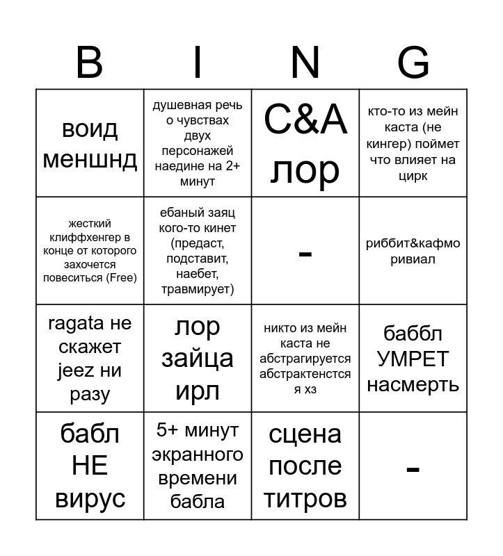 This bingo card has 16 words: 5+ минут экранного времени бабла, баббл УМРЕТ насмерть, C&A лор, воид меншнд, ragata не скажет jeez ни разу, душевная речь о чувствах двух персонажей наедине на 2+ минут, никто из мейн каста не абстрагируется абстрактенстся я хз, сцена после титров, жесткий клиффхенгер в конце от которого захочется повеситься (Free), ебаный заяц кого-то кинет (предаст, подставит, наебет, травмирует), бабл НЕ вирус, кто-то из мейн каста (не кингер) поймет что влияет на цирк, лор зайца ирл, риббит&кафмо ривиал, - and -.