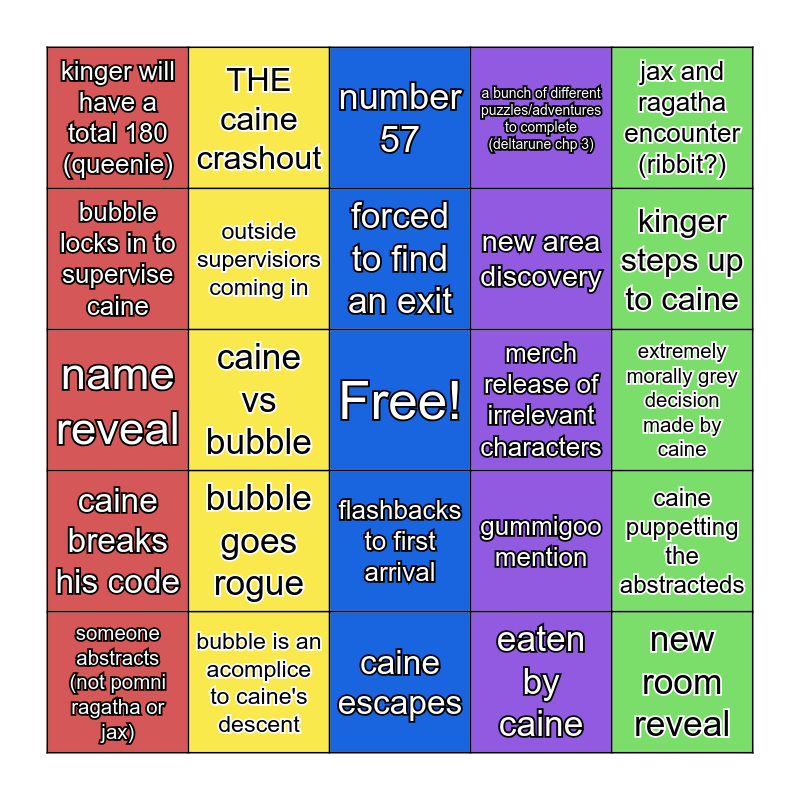 This bingo card has a free space and 24 words: someone abstracts (not pomni ragatha or jax), bubble goes rogue, forced to find an exit, eaten by caine, jax and ragatha encounter (ribbit?), kinger will have a total 180 (queenie), THE caine crashout, number 57, merch release of irrelevant characters, extremely morally grey decision made by caine, name reveal, outside supervisiors coming in, gummigoo mention, caine puppetting the abstracteds, bubble locks in to supervise caine, bubble is an acomplice to caine's descent, caine escapes, a bunch of different puzzles/adventures to complete (deltarune chp 3), kinger steps up to caine, caine breaks his code, caine vs bubble, flashbacks to first arrival, new area discovery and new room reveal.