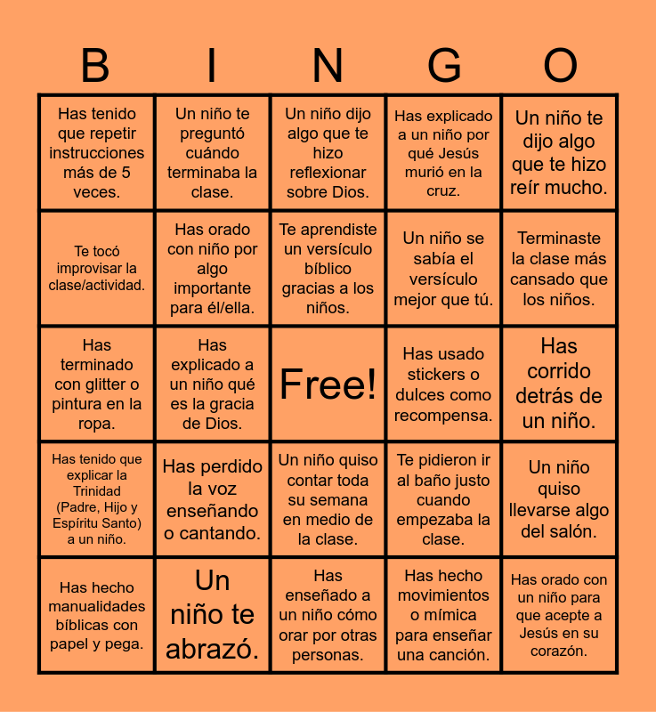 This bingo card has a free space and 24 words: Has perdido la voz enseñando o cantando., Un niño te abrazó., Te aprendiste un versículo bíblico gracias a los niños., Has hecho manualidades bíblicas con papel y pega., Un niño te dijo algo que te hizo reír mucho., Has tenido que repetir instrucciones más de 5 veces., Te tocó improvisar la clase/actividad., Un niño te preguntó cuándo terminaba la clase., Has usado stickers o dulces como recompensa., Un niño quiso contar toda su semana en medio de la clase., Un niño se sabía el versículo mejor que tú., Has terminado con glitter o pintura en la ropa., Te pidieron ir al baño justo cuando empezaba la clase., Un niño quiso llevarse algo del salón., Has orado con niño por algo importante para él/ella., Has hecho movimientos o mímica para enseñar una canción., Has corrido detrás de un niño., Un niño dijo algo que te hizo reflexionar sobre Dios., Terminaste la clase más cansado que los niños., Has explicado a un niño qué es la gracia de Dios., Has orado con un niño para que acepte a Jesús en su corazón., Has tenido que explicar la Trinidad (Padre, Hijo y Espíritu Santo) a un niño., Has explicado a un niño por qué Jesús murió en la cruz. and Has enseñado a un niño cómo orar por otras personas..