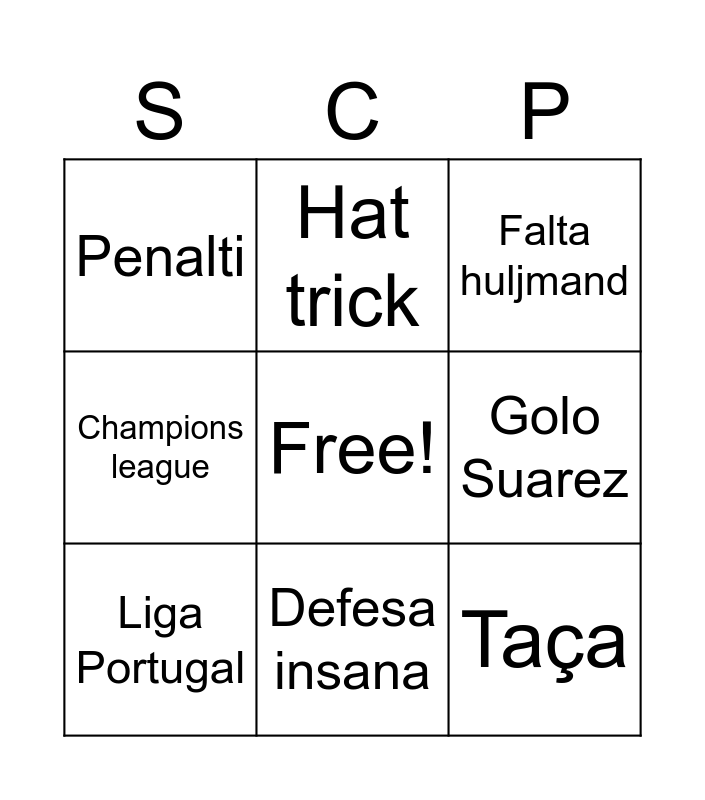 This bingo card has a free space and 8 words: Golo Suarez, Falta huljmand, Hat trick, Liga Portugal, Penalti, Taça, Champions league and Defesa insana.