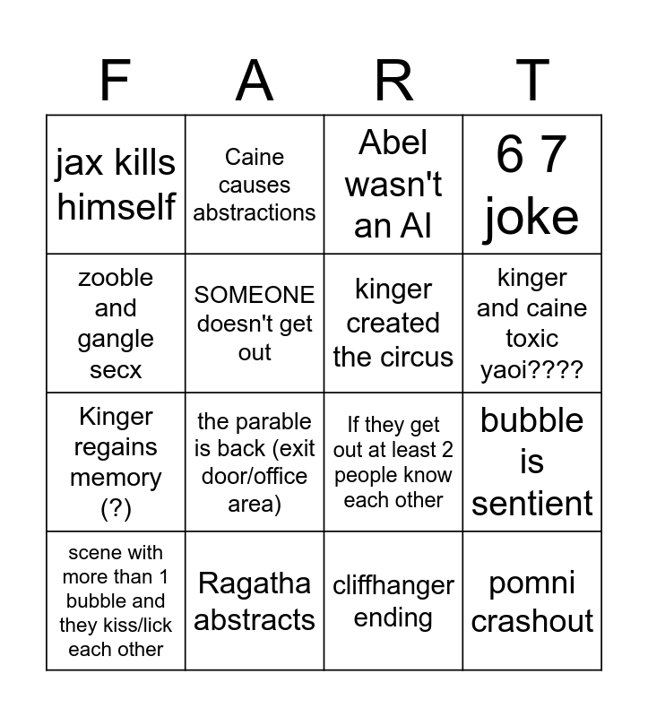 This bingo card has 16 words: Ragatha abstracts, bubble is sentient, Abel wasn't an AI, jax kills himself, Kinger regains memory (?), Caine causes abstractions, If they get out at least 2 people know each other, cliffhanger ending, zooble and gangle secx, SOMEONE doesn't get out, scene with more than 1 bubble and they kiss/lick each other, 6 7 joke, the parable is back (exit door/office area), kinger and caine toxic yaoi????, kinger created the circus and pomni crashout.