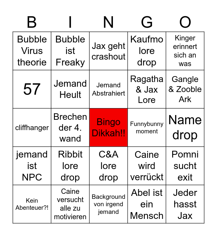 This bingo card has a free space and 24 words: Ribbit lore drop, Caine versucht alle zu motivieren, Jemand Abstrahiert, Kein Abenteuer?!, Kinger erinnert sich an was, Bubble Virus theorie, 57, Bubble ist Freaky, Funnybunny moment, C&A lore drop, Ragatha & Jax Lore, cliffhanger, Caine wird verrückt, Pomni sucht exit, Jemand Heult, Abel ist ein Mensch, Name drop, Jax geht crashout, Gangle & Zooble Ark, Brechen der 4. wand, Jeder hasst Jax, jemand ist NPC, Kaufmo lore drop and Background von irgend jemand.