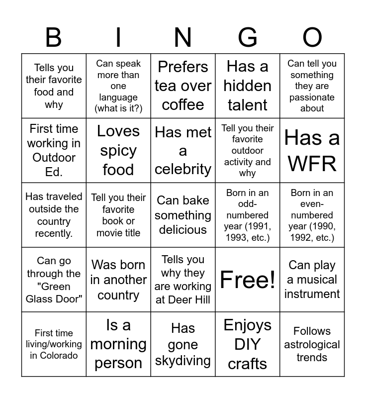 This bingo card has 25 words: Was born in another country, Has gone skydiving, Has met a celebrity, First time living/working in Colorado, Can tell you something they are passionate about, Tells you their favorite food and why, First time working in Outdoor Ed., Can speak more than one language (what is it?), Born in an odd-numbered year (1991, 1993, etc.), Tells you why they are working at Deer Hill, Tell you their favorite outdoor activity and why, Has traveled outside the country recently., Free!, Can play a musical instrument, Loves spicy food, Follows astrological trends, Born in an even-numbered year (1990, 1992, etc.), Prefers tea over coffee, Has a WFR, Tell you their favorite book or movie title, Can bake something delicious, Is a morning person, Can go through the "Green Glass Door", Has a hidden talent and Enjoys DIY crafts.