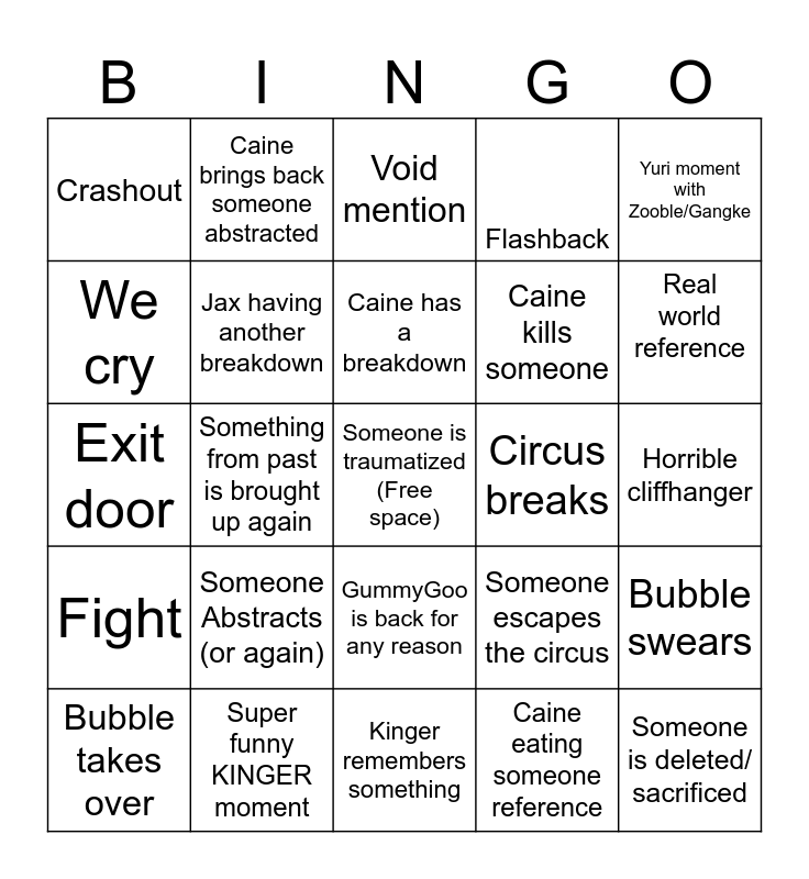 This bingo card has a free space and 24 words: Someone Abstracts (or again), Super funny KINGER moment, Caine has a breakdown, Bubble takes over, Yuri moment with Zooble/Gangke, Crashout, We cry, Caine brings back someone abstracted, Circus breaks, GummyGoo is back for any reason, Caine kills someone, Exit door, Someone escapes the circus, Bubble swears, Jax having another breakdown, Caine eating someone reference, Horrible cliffhanger, Void mention, Real world reference, Something from past is brought up again, Someone is deleted/ sacrificed, Fight, Flashback and Kinger remembers something.
