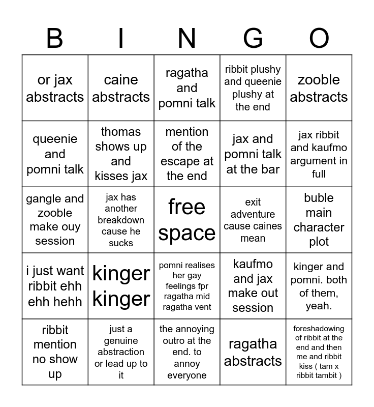 This bingo card has a free space and 24 words: ribbit mention no show up, kinger kinger, mention of the escape at the end, ragatha abstracts, zooble abstracts, or jax abstracts, caine abstracts, ragatha and pomni talk, exit adventure cause caines mean, buble main character plot, gangle and zooble make ouy session, thomas shows up and kisses jax, kaufmo and jax make out session, kinger and pomni. both of them, yeah., queenie and pomni talk, just a genuine abstraction or lead up to it, the annoying outro at the end. to annoy everyone, ribbit plushy and queenie plushy at the end, jax ribbit and kaufmo argument in full, i just want ribbit ehh ehh hehh, jax has another breakdown cause he sucks, pomni realises her gay feelings fpr ragatha mid ragatha vent, jax and pomni talk at the bar and foreshadowing of ribbit at the end and then me and ribbit kiss ( tam x ribbit tambit ).