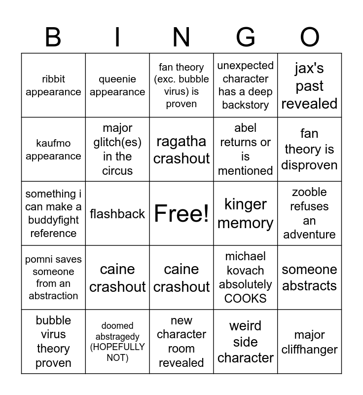 This bingo card has a free space and 24 words: caine crashout, doomed abstragedy (HOPEFULLY NOT), ragatha crashout, bubble virus theory proven, jax's past revealed, ribbit appearance, kaufmo appearance, queenie appearance, kinger memory, caine crashout, abel returns or is mentioned, something i can make a buddyfight reference, michael kovach absolutely COOKS, someone abstracts, major glitch(es) in the circus, weird side character, zooble refuses an adventure, fan theory (exc. bubble virus) is proven, fan theory is disproven, flashback, major cliffhanger, pomni saves someone from an abstraction, unexpected character has a deep backstory and new character room revealed.