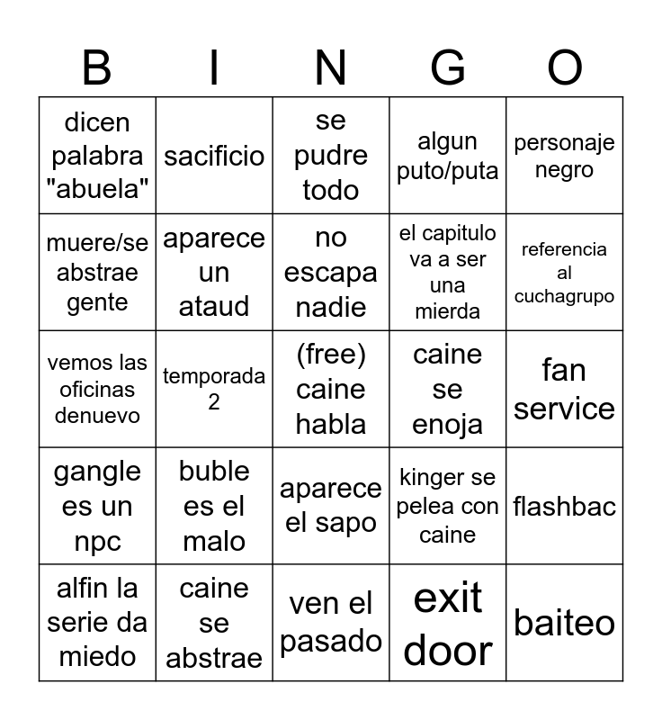 This bingo card has a free space and 24 words: buble es el malo, caine se abstrae, no escapa nadie, alfin la serie da miedo, personaje negro, dicen palabra "abuela", muere/se abstrae gente, sacificio, caine se enoja, aparece el sapo, el capitulo va a ser una mierda, vemos las oficinas denuevo, kinger se pelea con caine, flashbac, aparece un ataud, exit door, fan service, se pudre todo, referencia al cuchagrupo, temporada 2, baiteo, gangle es un npc, algun puto/puta and ven el pasado.