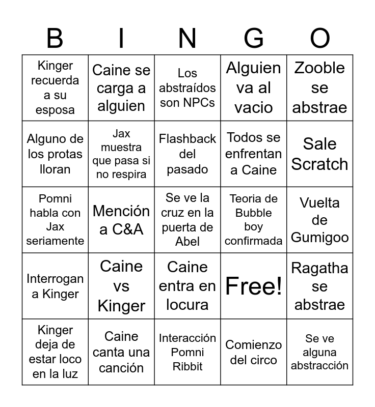 This bingo card has 25 words: Caine vs Kinger, Interacción Pomni Ribbit, Flashback del pasado, Kinger deja de estar loco en la luz, Zooble se abstrae, Kinger recuerda a su esposa, Alguno de los protas lloran, Caine se carga a alguien, Teoria de Bubble boy confirmada, Caine entra en locura, Todos se enfrentan a Caine, Pomni habla con Jax seriamente, Free!, Ragatha se abstrae, Jax muestra que pasa si no respira, Se ve alguna abstracción, Vuelta de Gumigoo, Los abstraídos son NPCs, Sale Scratch, Mención a C&A, Se ve la cruz en la puerta de Abel, Caine canta una canción, Interrogan a Kinger, Alguien va al vacio and Comienzo del circo.