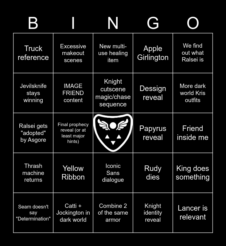 This bingo card has a free space and 24 words: Yellow Ribbon, Catti + Jockington in dark world, Knight cutscene magic/chase sequence, Seam doesn't say "Determination", We find out what Ralsei is, Truck reference, Jevilsknife stays winning, Excessive makeout scenes, Papyrus reveal, Iconic Sans dialogue, Dessign reveal, Ralsei gets "adopted" by Asgore, Rudy dies, King does something, IMAGE FRIEND content, Knight identity reveal, Friend inside me, New multi-use healing item, More dark world Kris outfits, Final prophecy reveal (or at least major hints), Lancer is relevant, Thrash machine returns, Apple Girlington and Combine 2 of the same armor.