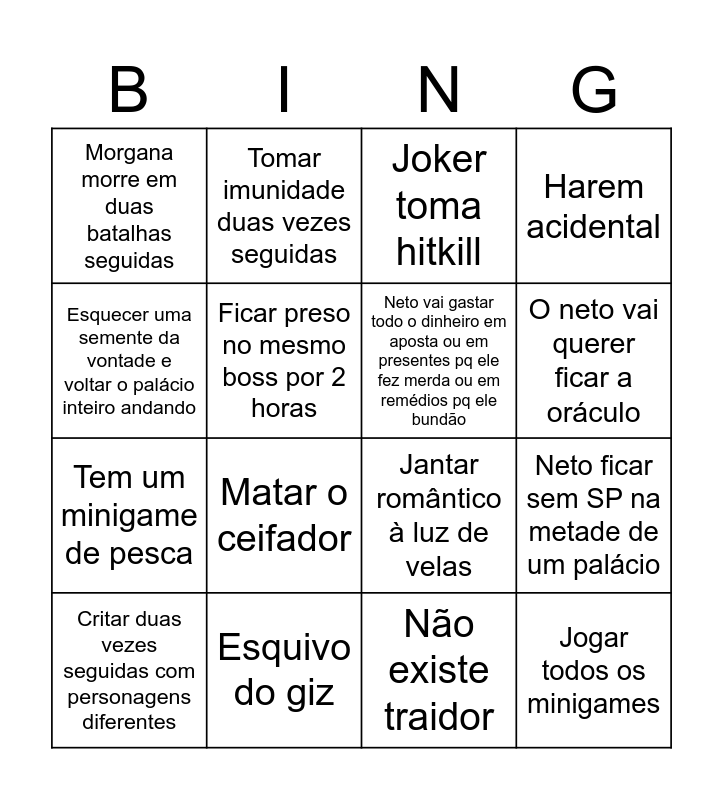This bingo card has 16 words: Esquivo do giz, Neto ficar sem SP na metade de um palácio, Joker toma hitkill, Morgana morre em duas batalhas seguidas, Tem um minigame de pesca, Tomar imunidade duas vezes seguidas, Jantar romântico à luz de velas, Não existe traidor, Esquecer uma semente da vontade e voltar o palácio inteiro andando, Ficar preso no mesmo boss por 2 horas, Critar duas vezes seguidas com personagens diferentes, Harem acidental, Matar o ceifador, O neto vai querer ficar a oráculo, Neto vai gastar todo o dinheiro em aposta ou em presentes pq ele fez merda ou em remédios pq ele bundão and Jogar todos os minigames.