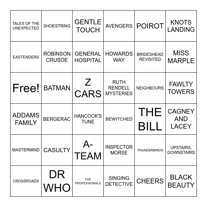 This bingo card has 36 words: INSPECTOR MORSE, A-TEAM, SINGING DETECTIVE, EASTENDERS, ADDAMS FAMILY, RUTH RENDELL MYSTERIES, ROBINSON CRUSOE, THE PROFESSIONALS, POIROT, THUNDERBIRDS, MISS MARPLE, AVENGERS, UPSTAIRS, DOWNSTAIRS, BATMAN, HOWARDS WAY, TALES OF THE UNEXPECTED, MASTERMIND, NEIGHBOURS, Free!, GENTLE TOUCH, Z CARS, BERGERAC, BEWITCHED, HANCOCK'S TUNE, THE BILL, SHOESTRING, BRIDESHEAD REVISITED, DR WHO, GENERAL HOSPITAL, KNOTS LANDING, BLACK BEAUTY, CROSSROADS, CAGNEY AND LACEY, FAWLTY TOWERS, CASULTY and CHEERS.
