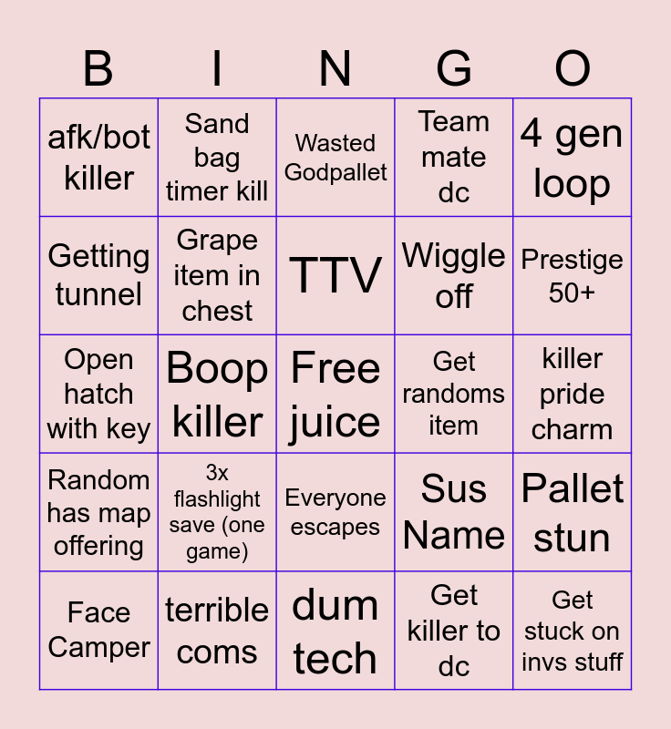 This bingo card has a free space and 49 words: 4x fakes (on one pallet), Get stuck on invs stuff, SPINN TO WIN, dum tech, 3x flashlight save (one game), Team slug or slugged, Sand bag timer kill, Mori or be mori-ed, Getting tunnel, Get nods in chase, Grape item in chest, Team mate dc, Pallet stun, Sus Name, 4%, Hatch Escape, TTV, Get randoms item, Jump scare, 4 gen loop, Boop killer, Get killer to dc, afk/bot killer, Wiggle off, No perks win, Prestige 50+, Face Camper, Slug race, Everyone escapes, Random has map offering, hacker, Get grabbed window, Get grabbed pallet, Big come back, terrible coms, window fake, fov tech, 3x respect, killer pride charm, CJ, Escape without getting hooked, 4 Great Skill Checks (in a row), Solo Gen, Bled out, Open hatch with key, Wasted Godpallet, Force locker with ds, Window tech and Make up a new tech.
