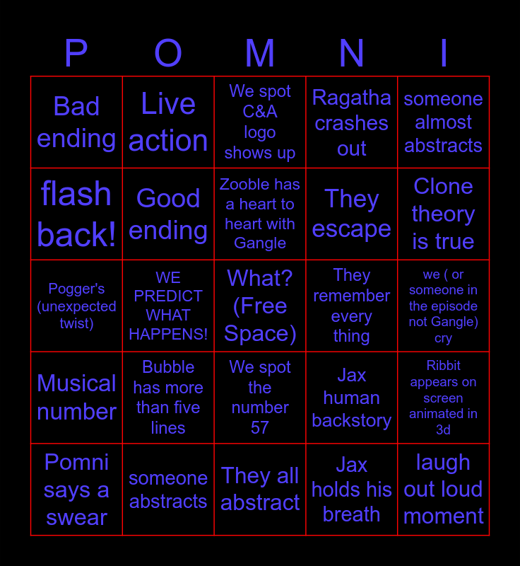 This bingo card has a free space and 30 words: someone abstracts, we all agree that this is the best ep so far, WE PREDICT WHAT HAPPENS!, Sad ending, Bad ending, We spot C&A logo shows up, Good ending, We spot the number 57, They remember every thing, They all abstract, we ( or someone in the episode not Gangle) cry, laugh out loud moment, Jax holds his breath, Kinger see's a BUG, Clone theory is true, Pomni is Ribbit, Jax human backstory, Musical number, Bubble has more than five lines, someone almost abstracts, Pogger's (unexpected twist), reference to previous ep, Live action, They escape, flash back!, Ragatha crashes out, Ribbit appears on screen animated in 3d, Pomni says a swear, Zooble has a heart to heart with Gangle and Kouphmo appears in 3d animation.