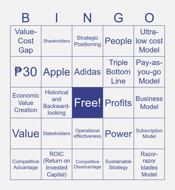 This bingo card has a free space and 34 words: Cost, Accounting Profitability, Competitive Advantage, Balanced Scorecard, Business Model, ₱30, Apple, Competitive Disadvantage, Triple Bottom Line, Razor-razor blades Model, Economic Value Creation, Shareholders, Sustainable Strategy, Freemium Model, Value, Historical and Backward-looking, Operational effectiveness, Profits, Subscription Model, Competitive Advantage, ROIC (Return on Invested Capital), Strategic analysis tool, People, Pay-as-you-go Model, EV Party, Stakeholders, Strategic Positioning, Planet, Ultra-low cost Model, Value-Cost Gap, Samsung, Adidas, Power and Business Plan.