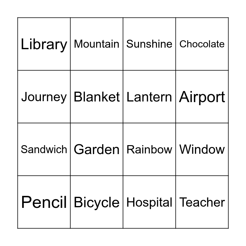 This bingo card has 16 words: Bicycle, Window, Sunshine, Library, Sandwich, Mountain, Rainbow, Hospital, Journey, Blanket, Pencil, Chocolate, Garden, Airport, Lantern and Teacher.