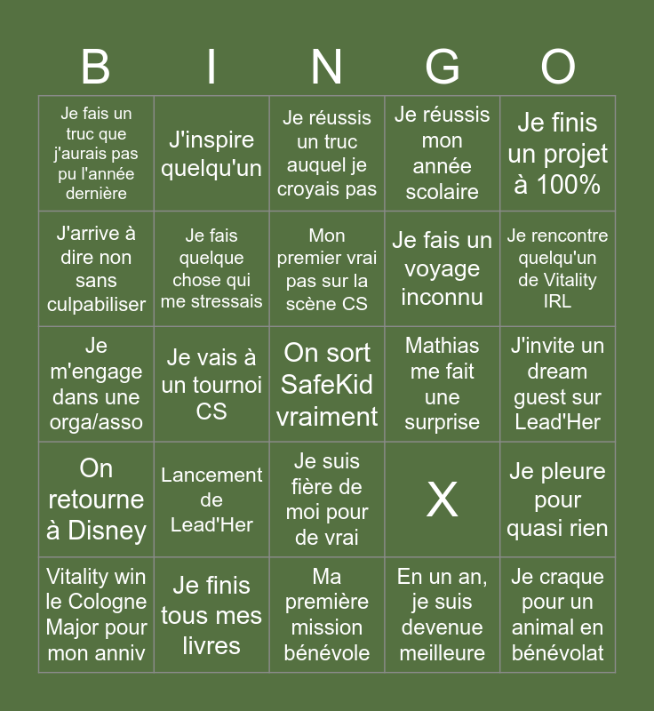 This bingo card has 25 words: Lancement de Lead'Her, Ma première mission bénévole, Mon premier vrai pas sur la scène CS, Vitality win le Cologne Major pour mon anniv, Je finis un projet à 100%, Je fais un truc que j'aurais pas pu l'année dernière, J'arrive à dire non sans culpabiliser, J'inspire quelqu'un, Mathias me fait une surprise, Je suis fière de moi pour de vrai, Je fais un voyage inconnu, Je m'engage dans une orga/asso, X, Je pleure pour quasi rien, Je fais quelque chose qui me stressais, Je craque pour un animal en bénévolat, J'invite un dream guest sur Lead'Her, Je réussis un truc auquel je croyais pas, Je rencontre quelqu'un de Vitality IRL, Je vais à un tournoi CS, On sort SafeKid vraiment, Je finis tous mes livres, On retourne à Disney, Je réussis mon année scolaire and En un an, je suis devenue meilleure.