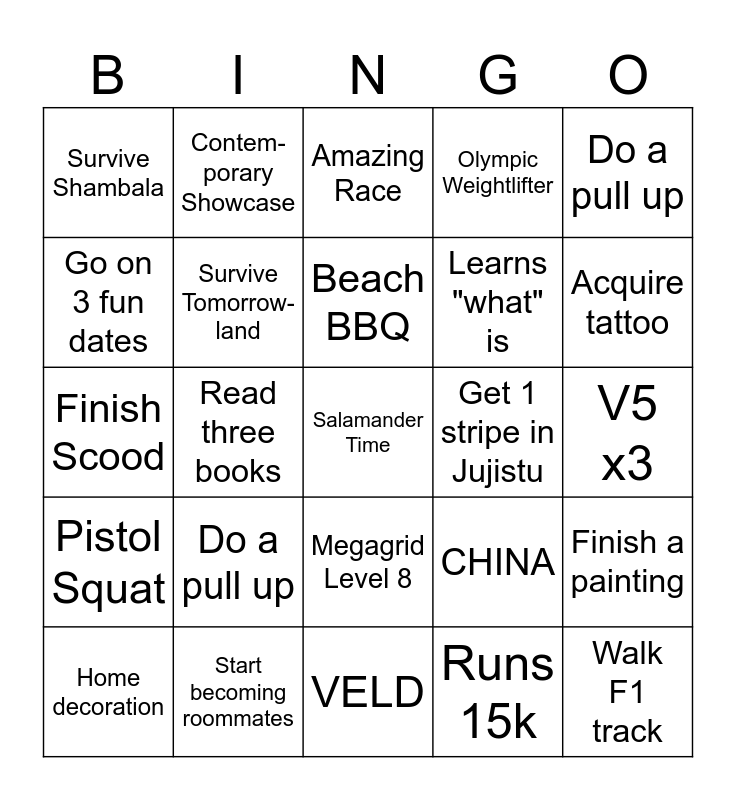 This bingo card has a free space and 24 words: Home decoration, Do a pull up, Beach BBQ, Runs 15k, Do a pull up, Survive Shambala, Contem-porary Showcase, Amazing Race, Get 1 stripe in Jujistu, V5 x3, Finish Scood, Survive Tomorrow-land, CHINA, Finish a painting, Go on 3 fun dates, Start becoming roommates, VELD, Olympic Weightlifter, Acquire tattoo, Pistol Squat, Read three books, Megagrid Level 8, Learns "what" is and Walk F1 track.