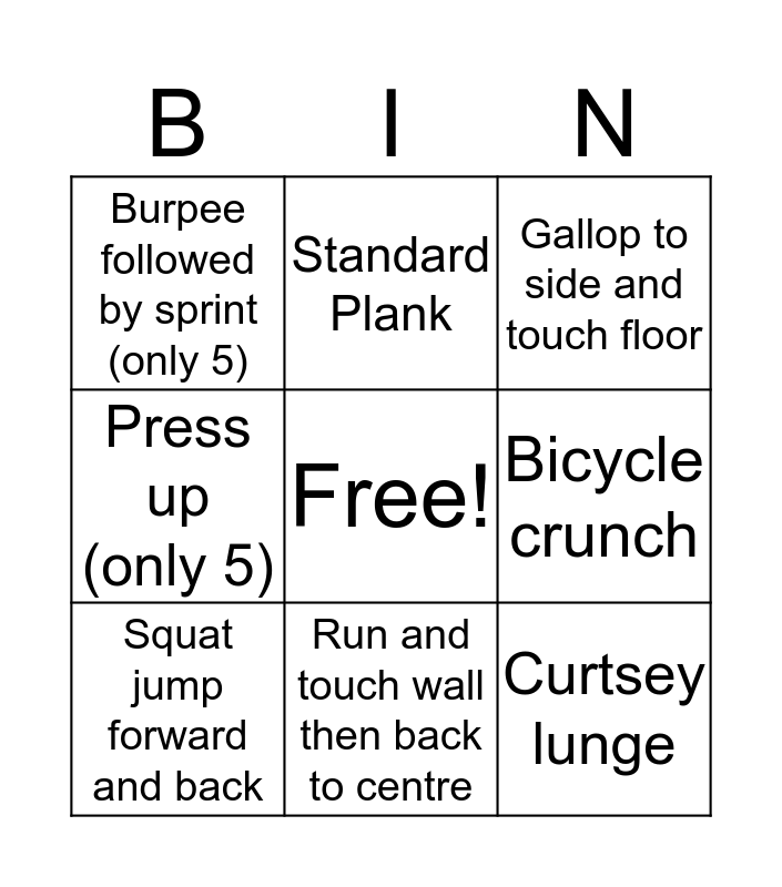 This bingo card has a free space and 8 words: Bicycle crunch, Gallop to side and touch floor, Standard Plank, Squat jump forward and back, Burpee followed by sprint (only 5), Curtsey lunge, Press up (only 5) and Run and touch wall then back to centre.
