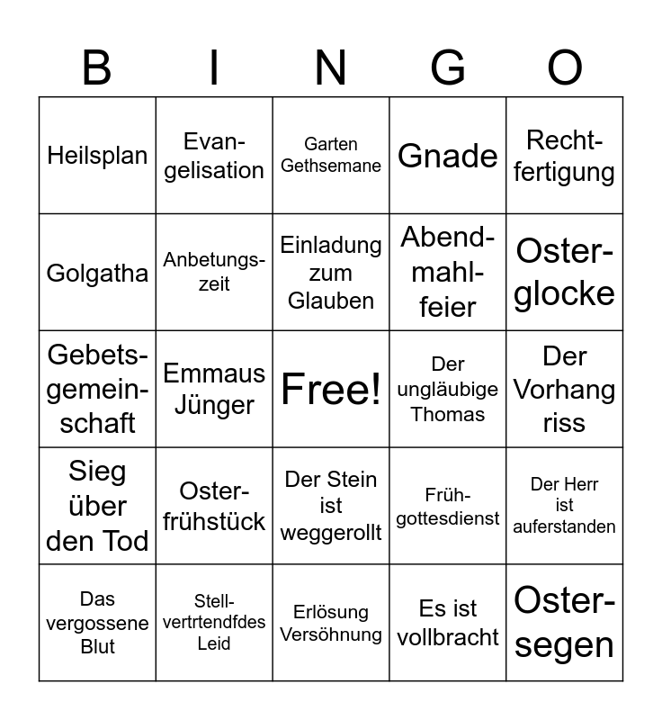 This bingo card has a free space and 24 words: Oster- frühstück, Stell- vertrtendfdes Leid, Einladung zum Glauben, Das vergossene Blut, Recht- fertigung, Heilsplan, Golgatha, Evan- gelisation, Der ungläubige Thomas, Der Stein ist weggerollt, Abend- mahl- feier, Gebets- gemein- schaft, Früh- gottesdienst, Der Herr ist auferstanden, Anbetungs- zeit, Es ist vollbracht, Der Vorhang riss, Garten Gethsemane, Oster- glocke, Emmaus Jünger, Oster- segen, Sieg über den Tod, Gnade and Erlösung Versöhnung.