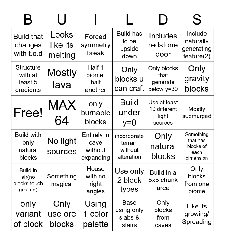 This bingo card has 36 words: Use only 2 block types, House with no right angles, Base using only slabs & stairs, Structure with at least 5 gradients, Build with only natural blocks, Build under y=0, Mostly lava, Using 1 color palette, Includes redstone door, Build in a 5x5 chunk area, Only gravity blocks, Build has to be upside down, Only blocks from one biome, MAX 64, Only blocks u can craft, Build that changes with t.o.d, Build in air(no blocks touch ground), Use at least 10 different light sources, Free!, Forced symmetry break, only burnable blocks, No light sources, incorporate terrain without alteration, Entirely in cave without expanding, Only natural blocks, Looks like its melting, Only blocks that generate below y=30, Only use ore blocks, Half 1 biome, half another, Include naturally generating feature(2), Like its growing/ Spreading, only variant of block, Something that has blocks of each dimension, Mostly submurged, Something magical and Only blocks from caves.