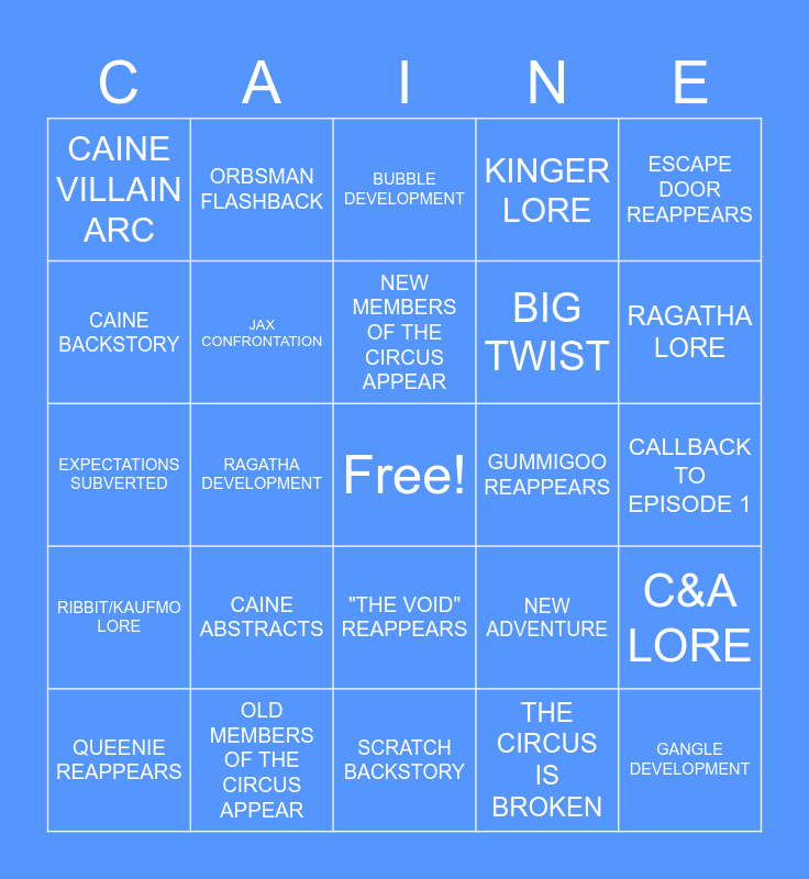 This bingo card has a free space and 24 words: CAINE ABSTRACTS, OLD MEMBERS OF THE CIRCUS APPEAR, NEW MEMBERS OF THE CIRCUS APPEAR, QUEENIE REAPPEARS, ESCAPE DOOR REAPPEARS, CAINE VILLAIN ARC, CAINE BACKSTORY, ORBSMAN FLASHBACK, GUMMIGOO REAPPEARS, "THE VOID" REAPPEARS, BIG TWIST, EXPECTATIONS SUBVERTED, NEW ADVENTURE, C&A LORE, JAX CONFRONTATION, THE CIRCUS IS BROKEN, CALLBACK TO EPISODE 1, BUBBLE DEVELOPMENT, RAGATHA LORE, RAGATHA DEVELOPMENT, GANGLE DEVELOPMENT, RIBBIT/KAUFMO LORE, KINGER LORE and SCRATCH BACKSTORY.