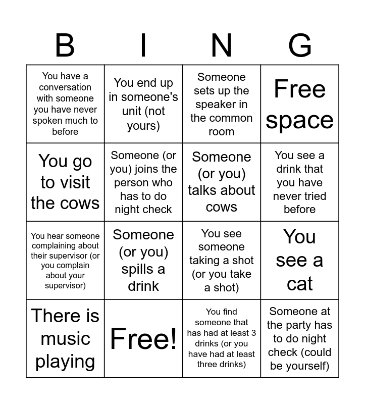 This bingo card has 16 words: Free!, You see a cat, Someone sets up the speaker in the common room, You have a conversation with someone you have never spoken much to before, You hear someone complaining about their supervisor (or you complain about your supervisor), You end up in someone's unit (not yours), You see someone taking a shot (or you take a shot), You find someone that has had at least 3 drinks (or you have had at least three drinks), You go to visit the cows, Someone (or you) joins the person who has to do night check, There is music playing, Free space, Someone (or you) spills a drink, You see a drink that you have never tried before, Someone (or you) talks about cows and Someone at the party has to do night check (could be yourself).
