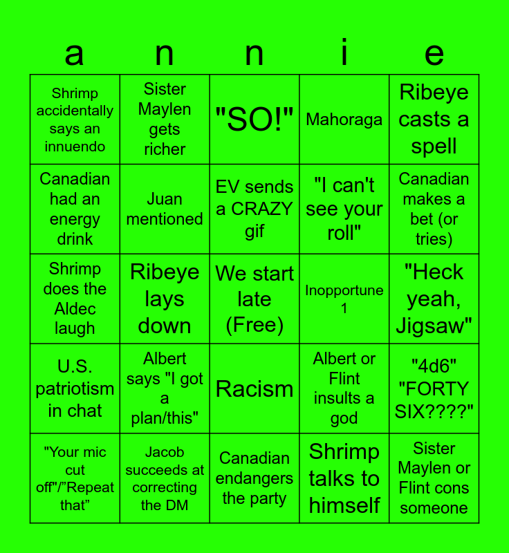 This bingo card has a free space and 25 words: Albert says "I got a plan/this", Canadian endangers the party, EV sends a CRAZY gif, "Your mic cut off"/”Repeat that”, Ribeye casts a spell, Shrimp accidentally says an innuendo, Canadian had an energy drink, Sister Maylen gets richer, Inopportune 1, Racism, "I can't see your roll", Shrimp does the Aldec laugh, Albert or Flint insults a god, "4d6" "FORTY SIX????", Juan mentioned, Someone launches an activity on downtime, "Heck yeah, Jigsaw", "SO!", Canadian makes a bet (or tries), Ribeye lays down, Sister Maylen or Flint cons someone, Jacob succeeds at correcting the DM, U.S. patriotism in chat, Mahoraga and Shrimp talks to himself.