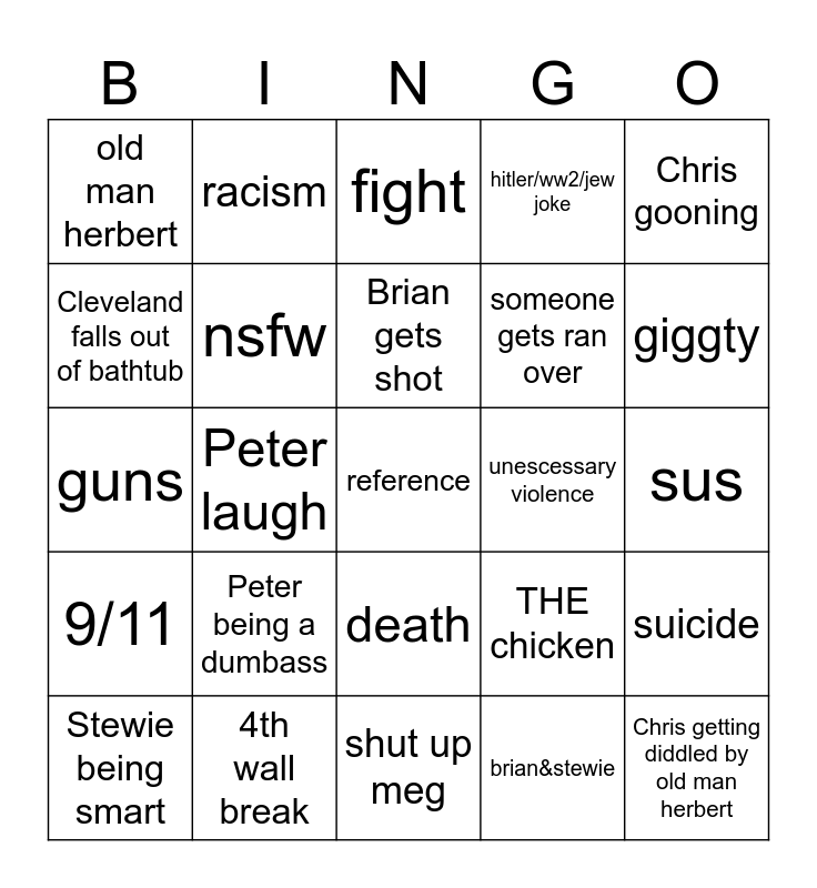 This bingo card has 25 words: Peter being a dumbass, shut up meg, Brian gets shot, Stewie being smart, Chris gooning, old man herbert, Cleveland falls out of bathtub, racism, unescessary violence, death, someone gets ran over, guns, THE chicken, suicide, nsfw, Chris getting diddled by old man herbert, sus, fight, giggty, Peter laugh, reference, 4th wall break, 9/11, hitler/ww2/jew joke and brian&stewie.