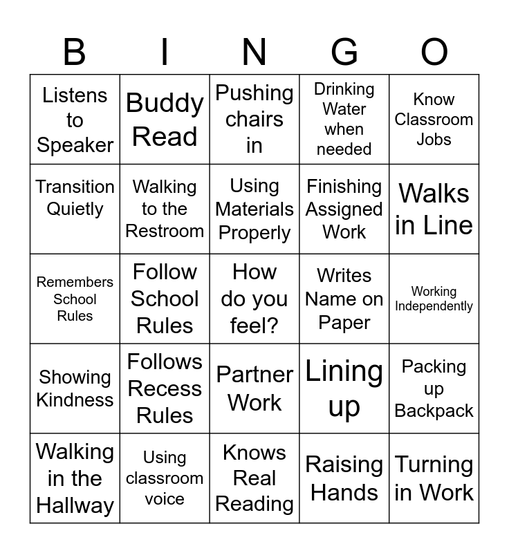 This bingo card has a free space and 29 words: Walking into the Classroom, Using classroom voice, Pushing chairs in, Waiting for turn, Know Classroom Jobs, Listens to Speaker, Walking to the Restroom, Using Materials Properly, Writes Name on Paper, Packing up Backpack, Walking in the Hallway, Follow School Rules, Raising Hands, Turning in Work, Remembers School Rules, Being Prepared, Knows Real Reading, Lining up, Walks in Line, Showing Kindness, Follows Recess Rules, Trying my Best, Finishing Assigned Work, Working Independently, Transition Quietly, Buddy Read, Partner Work, Drinking Water when needed and Keep Desk Clean.